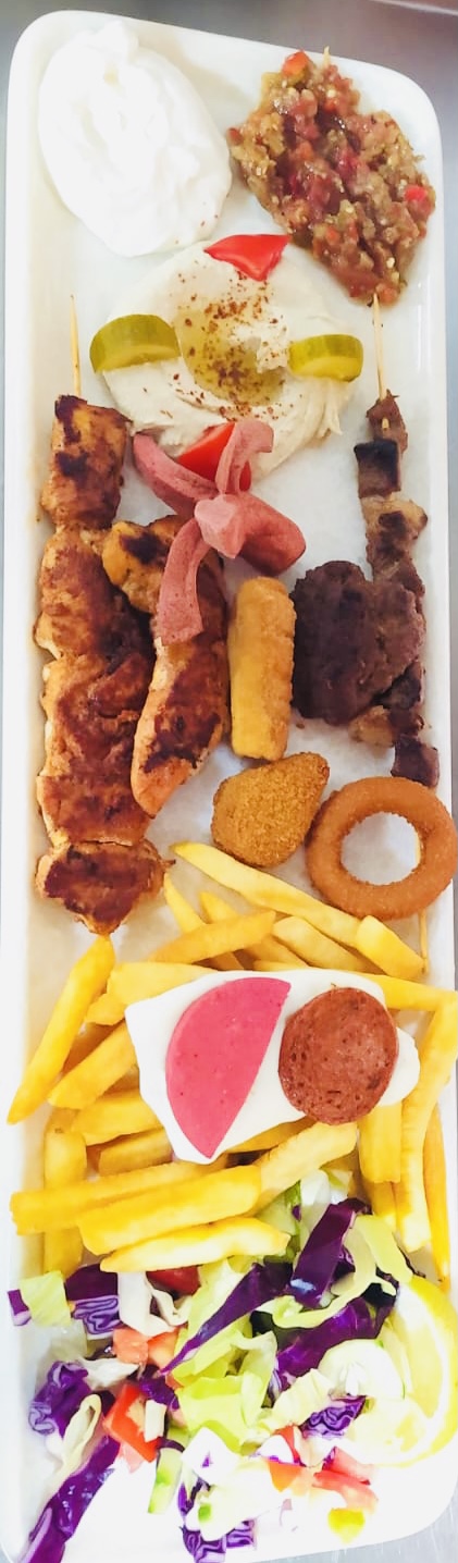 Çöp şiş tavuk, çöp şiş et, tavuk bonfile, köfte, nugget, kraket patates, soğan halkası, sucuk, salam, kızarmış sosis, humus, süzme, abagannüç, pomfrit patates üstü eritilmiş kaşar, salata