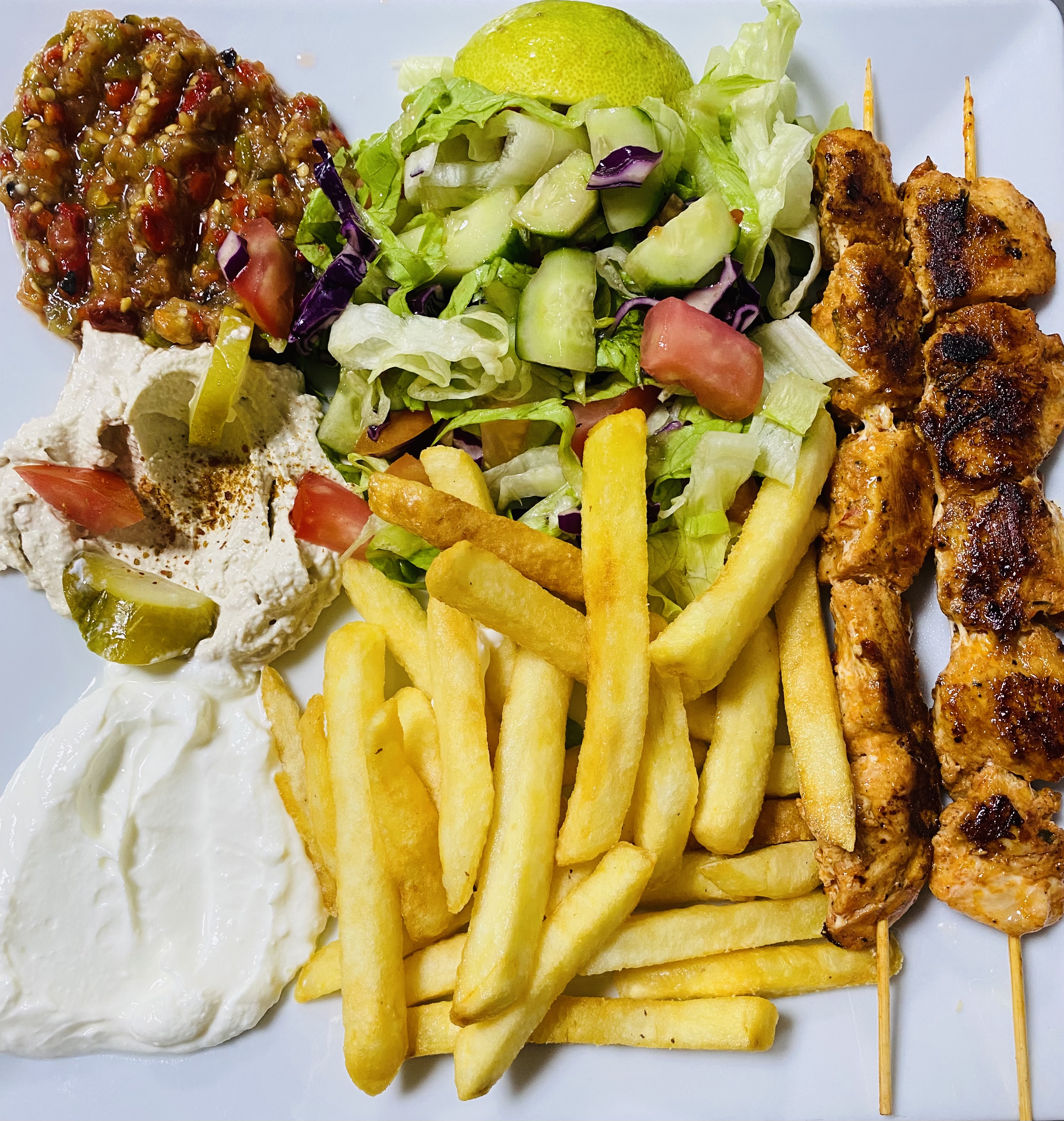 200 gr tavuk ile hazırlanmaktadır. Humus, süzme, abagannüç, salata, pomfrit patates ile servis edilir.