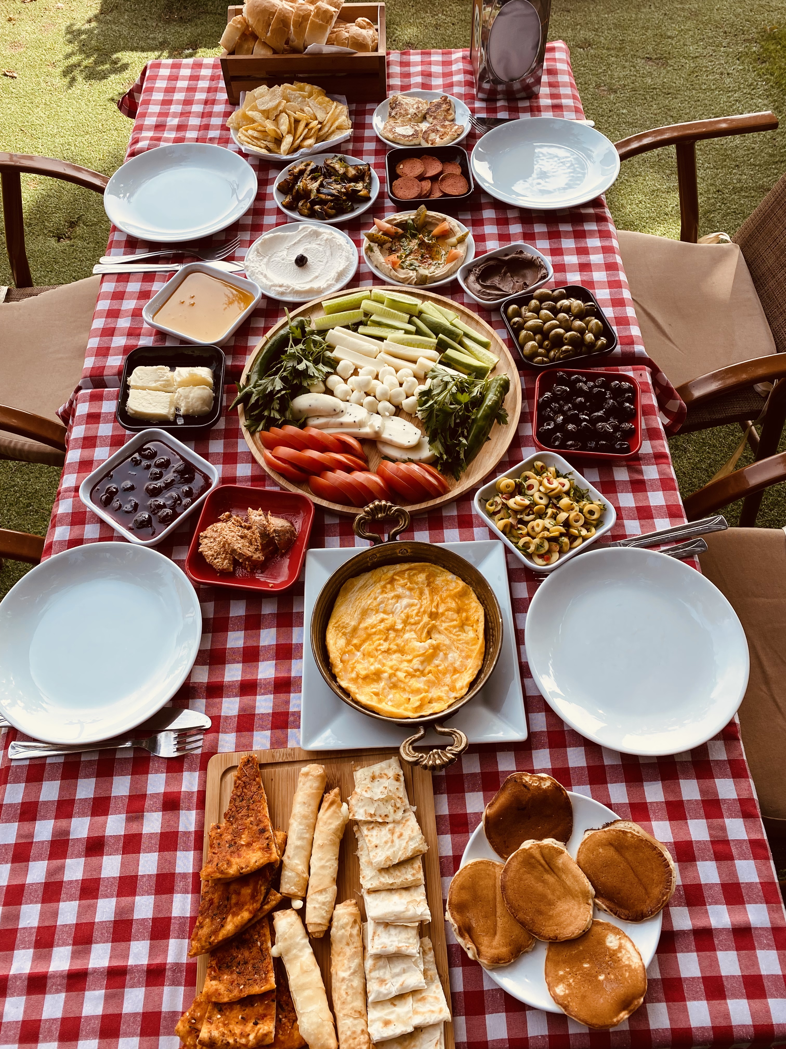 Yeşil zeytin, siyah zeytin, salatalık, domates, biber, yeşillik, dil peyniri, çörek otlu peynir, misket peynir, kuru çökelek, humus, tuzlu yoğurt, taze çökelek salatası, tereyağı, bal,çokokren, reçel, krep, gözleme, sigara böreği, katıklı ekmek, kızarmış sucuk, patates kızartması, patlıcan kızartması, omlet, kızarmış peynir, somun ekmek, tandır ekmeği, çay potu,