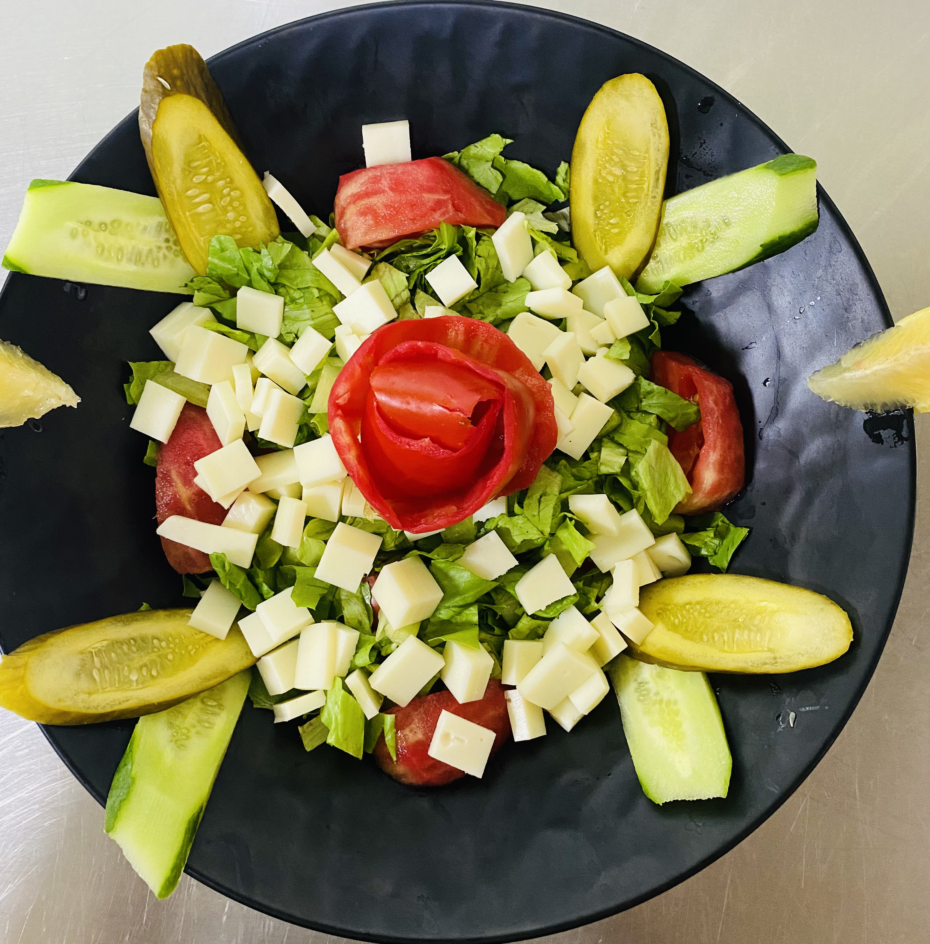 Salatalık,domates,marul,kaşar peyniri ile hazırlanmaktadır. Tercihe göre belirtildiğinde nane ve maydonoz eklenmektedir.