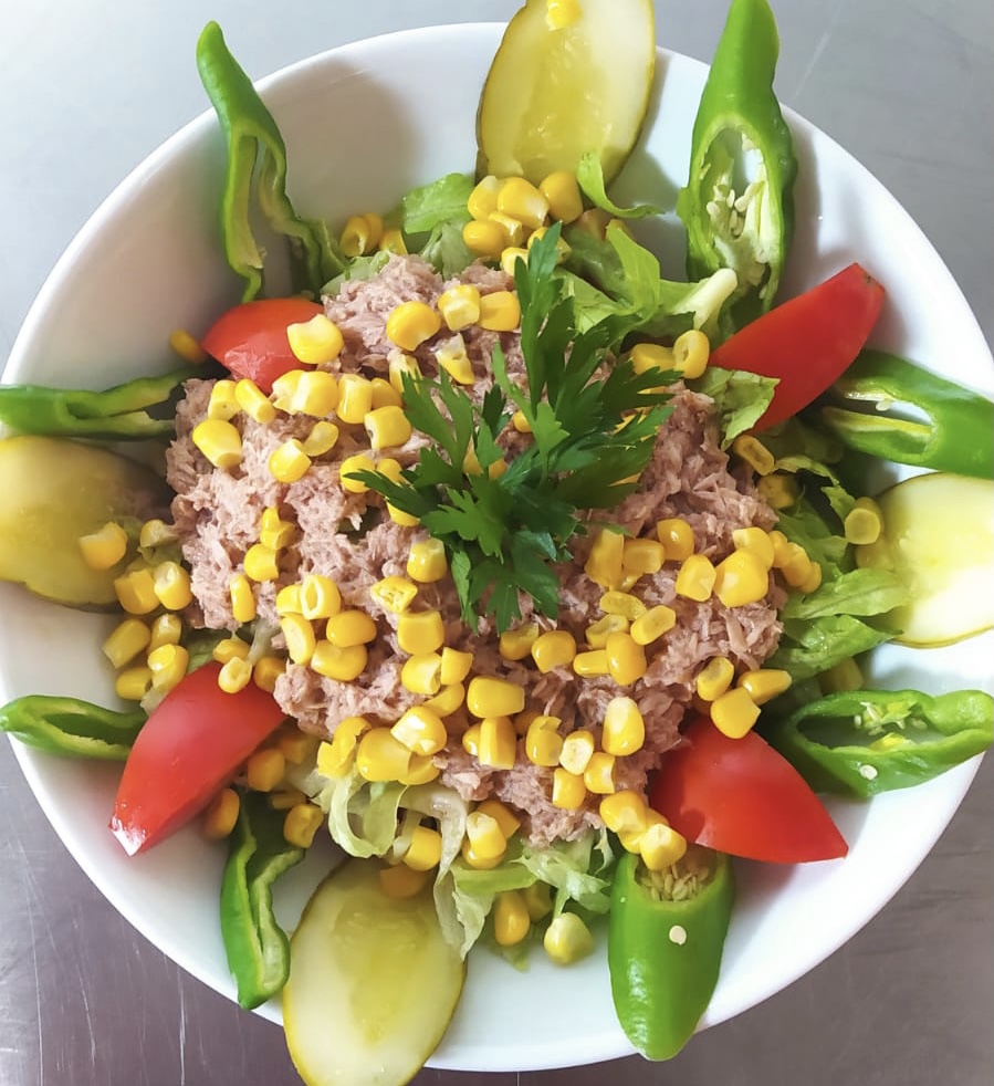 Ton balığı, salatalık, domates, marul, Mısır, maydonoz ile hazırlanmaktadır. İsteğe bağlı olarak nane ve kuru soğan eklenmektedir.