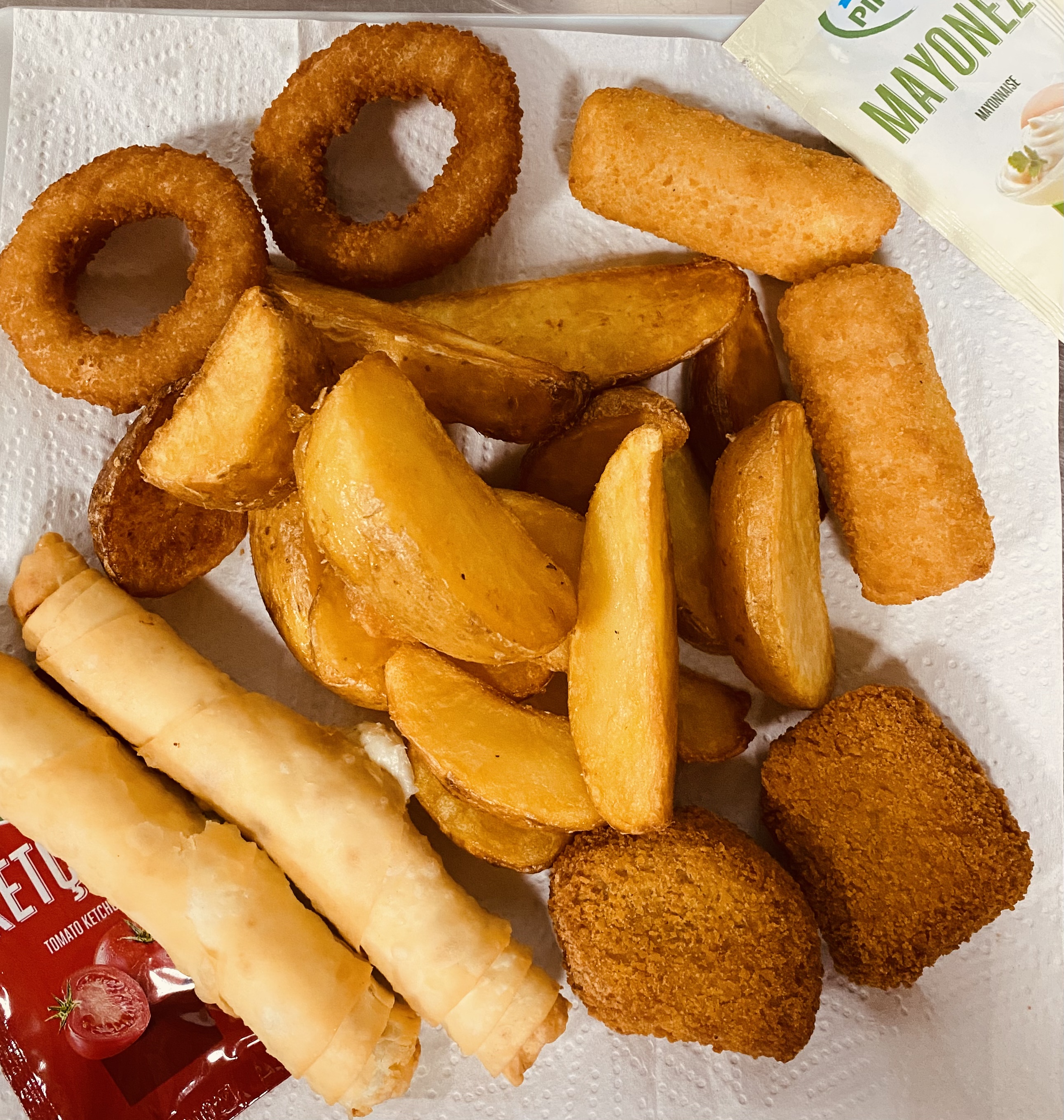 Sigara böreği, elma dilim patates, nugget, kroket patates, soğan halkası