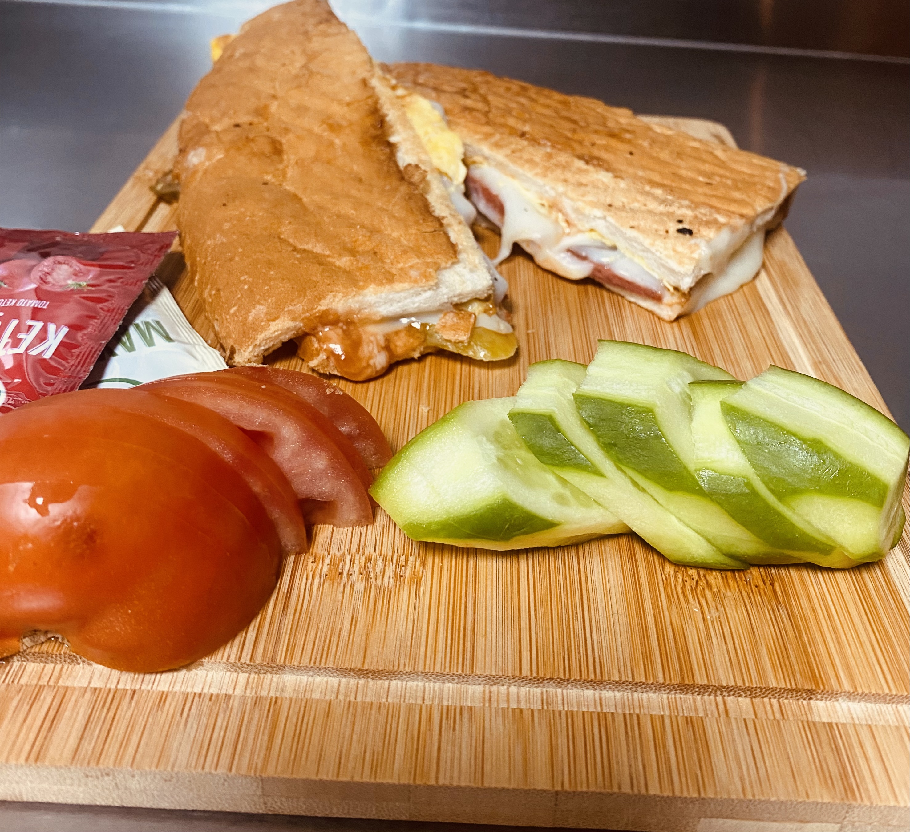 Yarım somun ekmeğe, yumurta, sucuk, sosis, kaşar peyniri, turşu, ketçap, mayonez